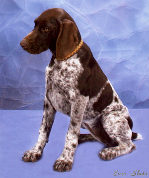 In 1998, a prominent breeder client of mine had an out-of-town family emergency that left her in a severe quandary: she had a champion German Shorthair bitch, bred to a multiple Best In Show winner, due to whelp literally any minute. I volunteered to whelp the litter out for her. She dropped "Sparkle" off with me at my veterinary hospital on her way to the airport. I took Sparkle home with me that afternoon. Sparkle had the first pup about 5 minutes after I got her unloaded and settled in a whelping crate!